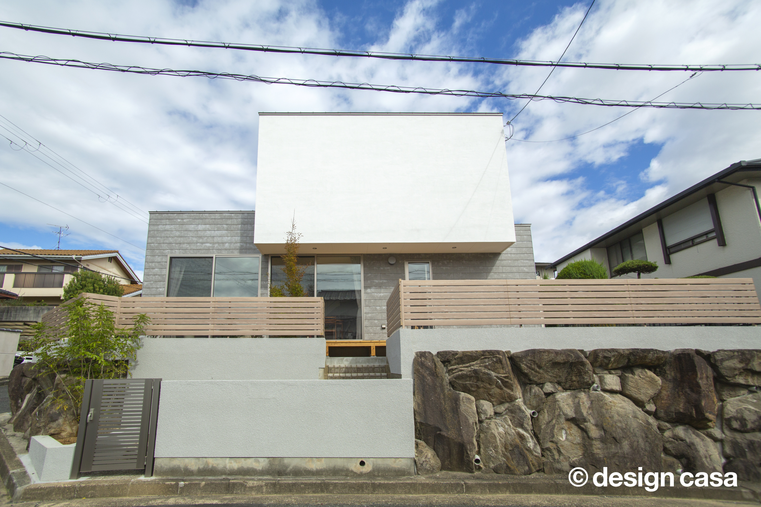 S様邸の安全を支えるのは、高度な技術で築かれたRC造擁壁と、天然石です。厳しいがけ条例をクリアするだけでなく、建物のデザインと調和するよう、細部までこだわりました。この擁壁工事は、ハウスメーカーでは対応が難しいケースが多いですが、MyDesignなら、豊富な経験と実績で、安心・安全な擁壁をご提供できます。