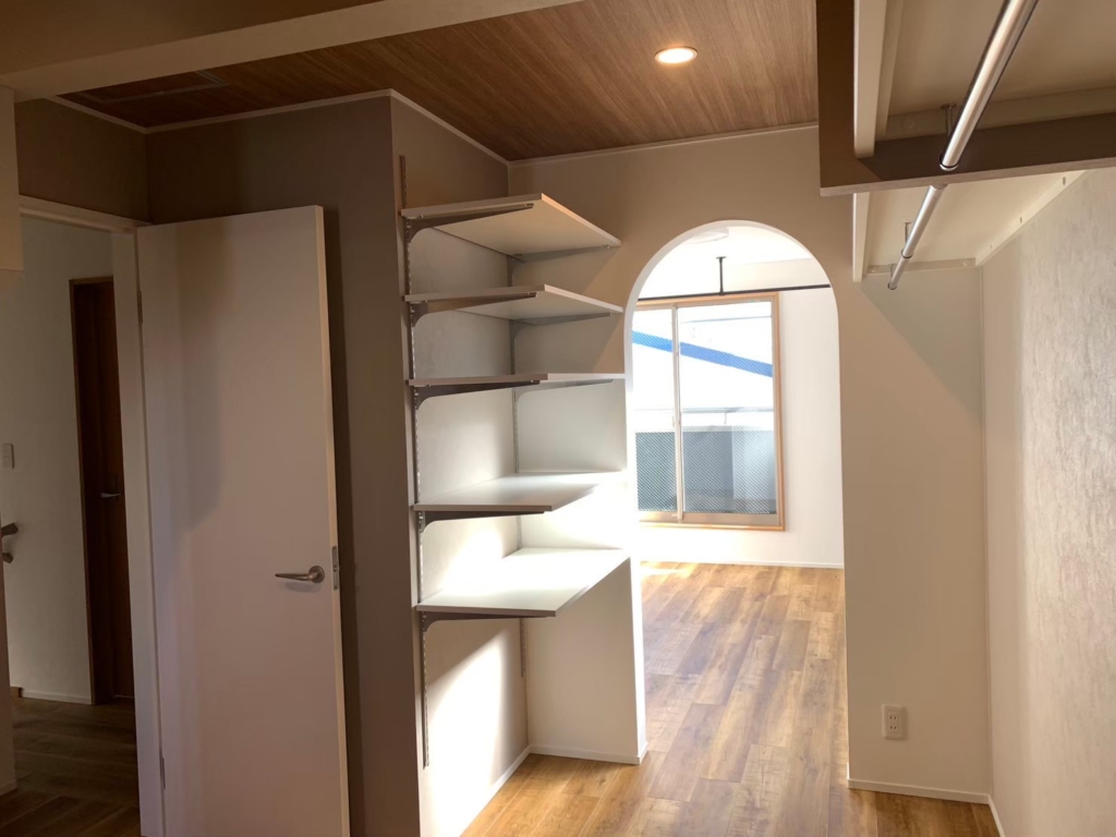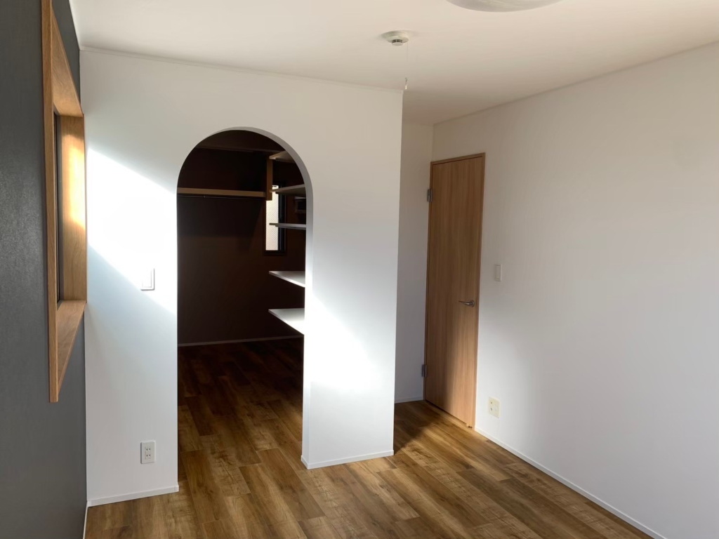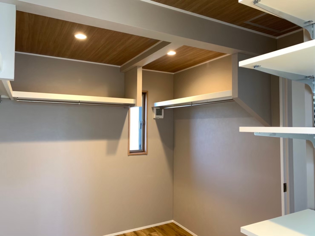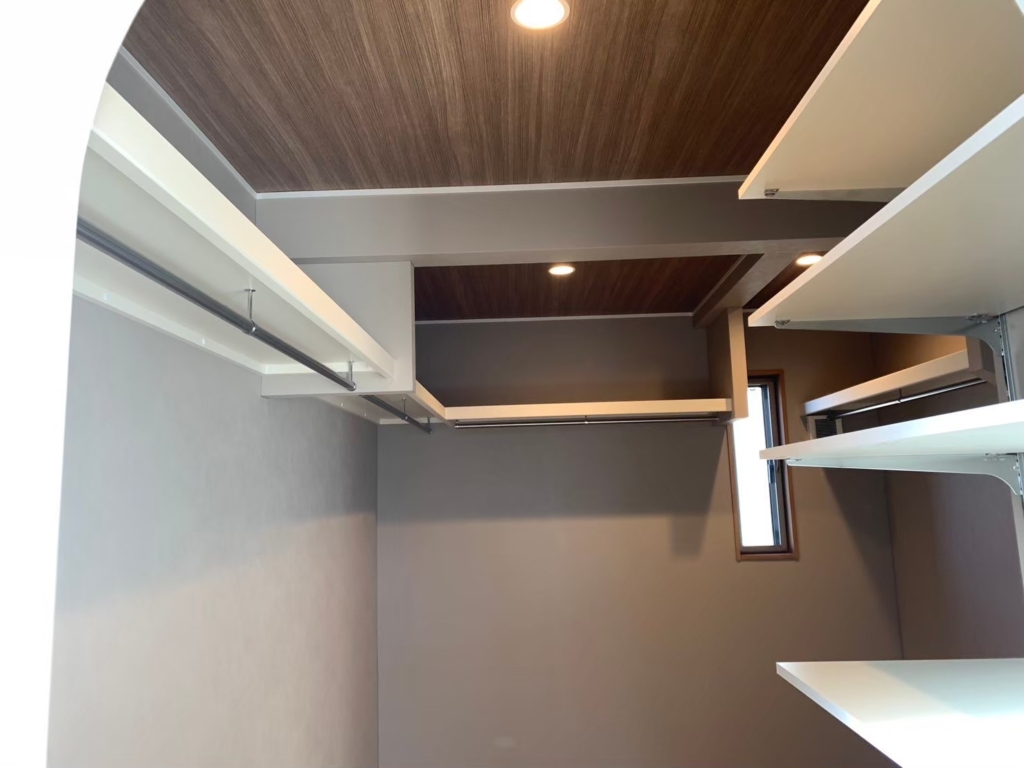 - おしゃれなR壁が目を惹くウォークインクローゼット(WIC): 収納力はもちろん、デザイン性にもこだわりました。R壁が空間に柔らかさと奥行きをもたらし、毎日の洋服選びが楽しくなるような空間を演出します。