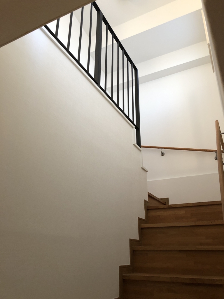 もともとの壁を取り払い、視線が抜けるアイアンの手すりを採用しました。 実はこれ、海外からの輸入部材なんです。 到着まで3週間かかりましたが、待った甲斐がありました。既製品にはない洗練されたラインが、空間のグレードを一気に引き上げています。