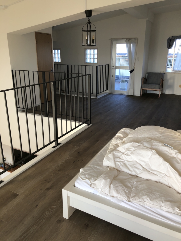 2階は寝室スペースです。 1階のリビングから見上げた時に、このブラックのアイアン越しに気配が感じられる設計になっています。