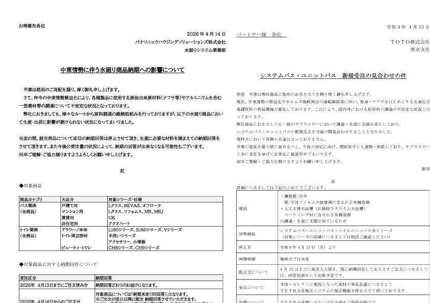 現在、TOTOやパナソニックをはじめとする大手メーカーから、相次いで「システムバスやトイレなどの新規受注停止、および納期未定」の通達が届いております。TOTOは4月13日より新規受注を当面見合わせており 、パナソニックも4月14日以降の注文分は納期未定(即日の納期回答停止)となっています 。